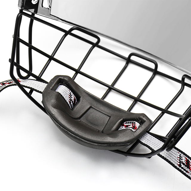 The black steel cage provides superior impact resistance, protecting against pucks and sticks while maintaining a lightweight feel.
