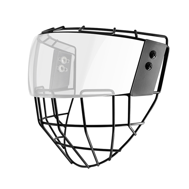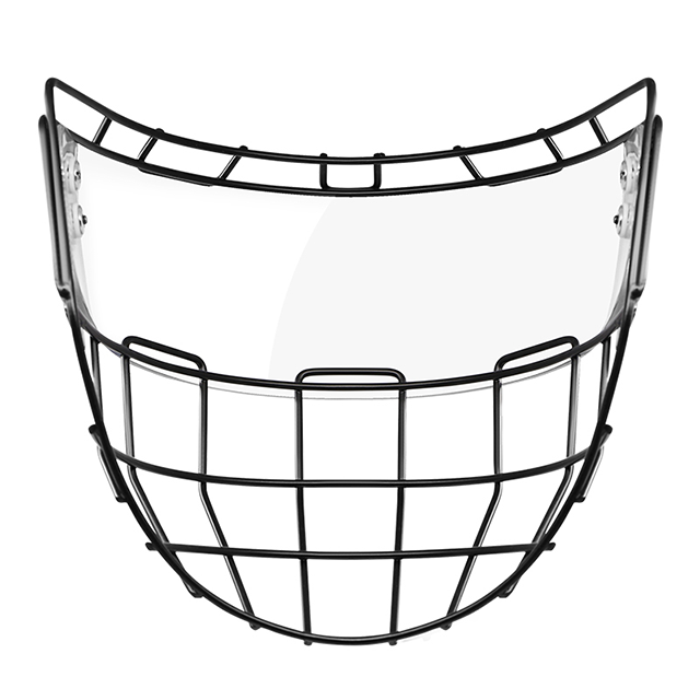 The black steel cage offers superior impact resistance, protecting against pucks, sticks, and collisions while maintaining a lightweight design.
