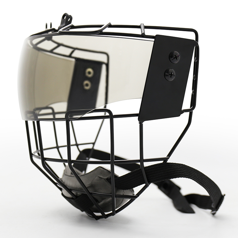 Before use, ensure the visor and steel cage are securely mounted to a compatible hockey helmet using the provided screws and brackets. Adjust the position so the visor aligns with eye level and the cage sits comfortably around the chin and jaw. Clean the visor regularly with mild soap and water to preserve the anti-fog coating. Avoid abrasive materials to prevent scratches. Always inspect the cage and fasteners before each game to ensure maximum safety.