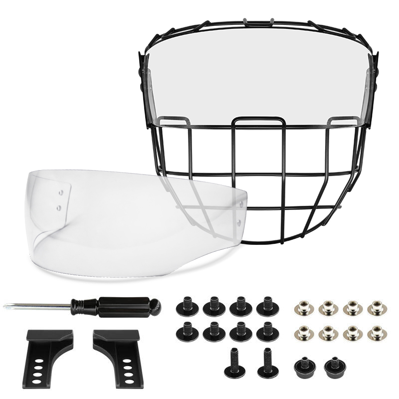 The Anti-Fog Visor & Steel Wire Combo Ice Hockey Cage with Replaceable Visor Set is designed to deliver elite-level protection, clarity, and flexibility for competitive ice hockey players. This hybrid cage combines a high-strength steel wire lower cage with a full-coverage polycarbonate visor, offering excellent facial protection without sacrificing visibility. The advanced anti-fog visor ensures clear vision during high-intensity play, while the replaceable visor system allows players to easily switch lens colors based on lighting conditions or personal preference. Built for durability, comfort, and easy installation, this combo cage is ideal for both training and game use.