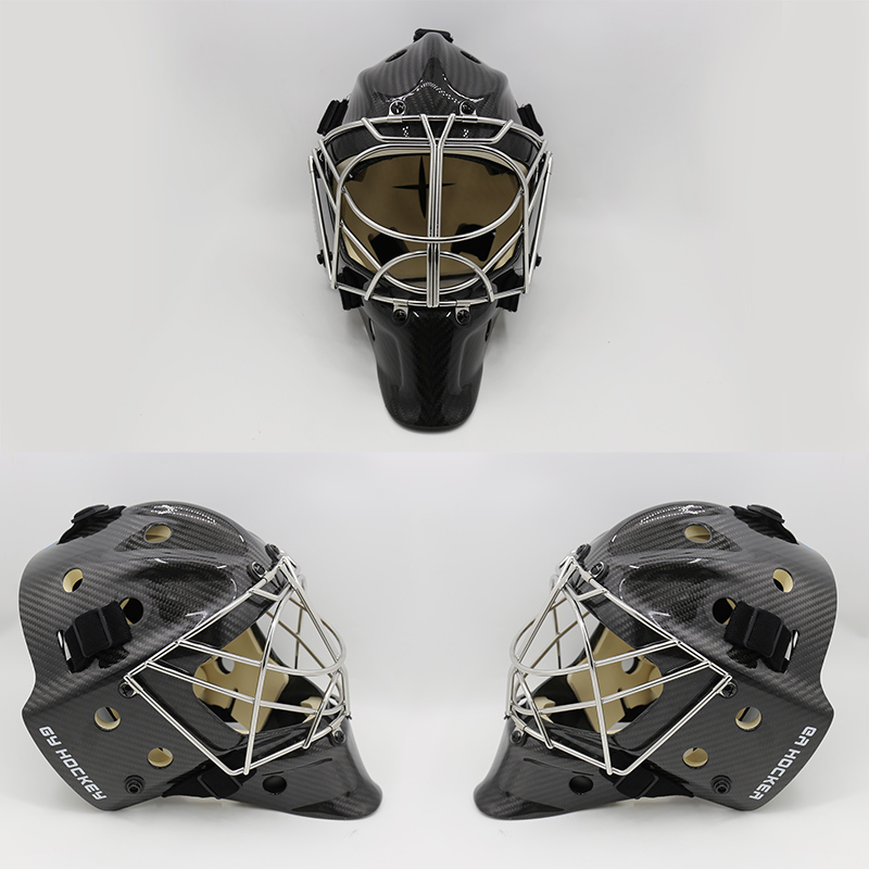 GY high-end customized ice hockey goalie mask is crafted from a fusion of carbon fiber and fiberglass, which embodies a synthesis of cutting-edge materials and visionary design elements.