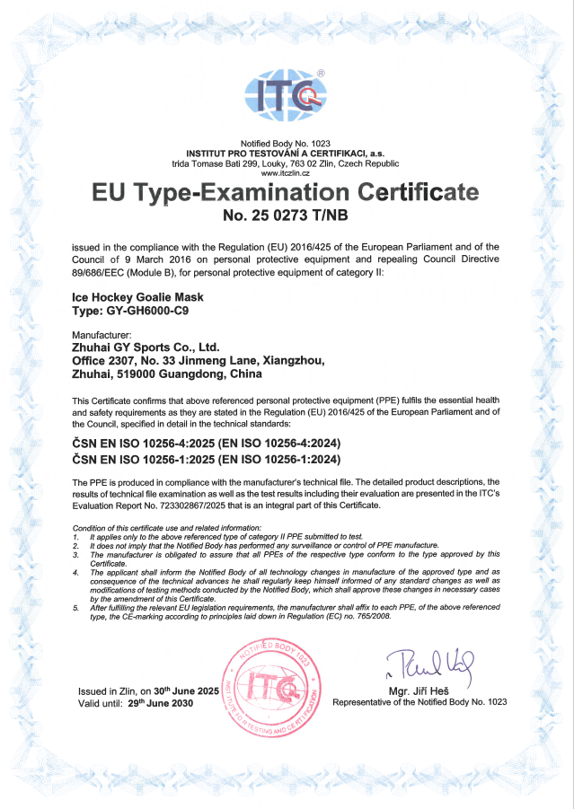 GY Optical, a leading manufacturer of professional ice hockey equipment and a subsidiary of GY Sports, is proud to announce that our GH6000 Series Goalkeeper Helmets (Models: GH6000-C8 & GH6000-C9) have officially obtained CE certification, meeting the stringent safety standards of the European market.This milestone reaffirms our commitment to delivering high-performance, reliable protective gear for ice hockey athletes worldwide.